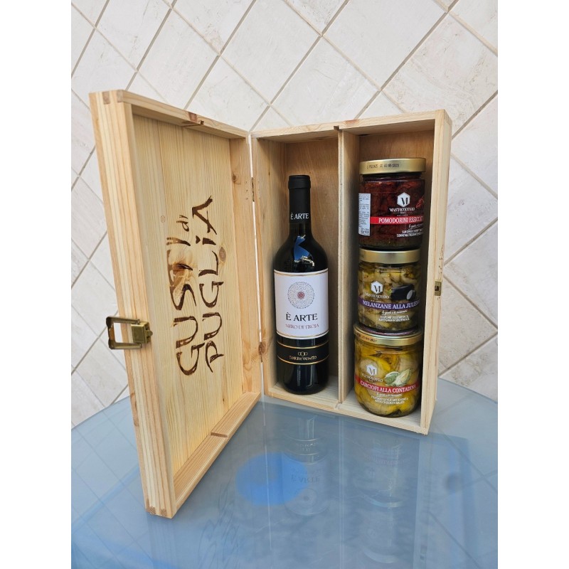 Donating a GUSTI DI PUGLIA Wooden Box at any time of the year is a sign of love, affection, friendship, esteem and gratitude. Whether it is a personal gift, a present for a work colleague, or a food and wine gift idea for Christmas, the important thing is that the content is always of quality.