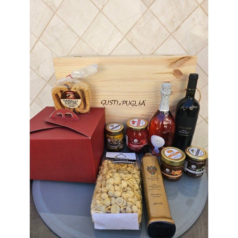 Donating a GUSTI DI PUGLIA Wooden Box at any time of the year is a sign of love, affection, friendship, esteem and gratitude. Whether it is a personal gift, a present for a work colleague, or a food and wine gift idea for Christmas, the important thing is that the content is always of quality.