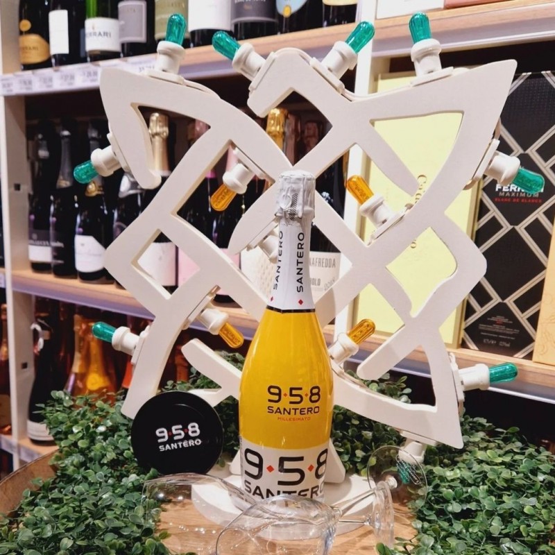 Santero Pop Art è lo spumante extra dry della linea 958 che concretizza l'obiettivo di un prodotto fuori dagli schemi, di un'arte rinnovata, che dai vigneti all'uva si trasforma in bollicine, di quelle modaiole, ricercate, che fanno tendenza. La Cuvée di Santero nasce tra le lussureggianti colline delle Langhe, a due passi da Monferrato ed è ottenuto solo da uve a bacca bianca. Dopo i tradizionali processi di vinificazione, la spumantizzazione avviene in grandi autoclavi d'acciaio secondo i criteri del metodo Charmat. Un'onda di stimolanti bollicine che arrivano direttamente al cuore, con la capacità di stupire anche i palati più raffinati.