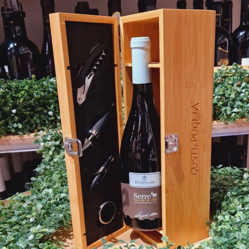 Serre è un vino rosso prodotto con uve susumaniello in purezza, antico vitigno autoctono pugliese dallo strano nome, susumaniello significa somarello, piccolo somaro. Il nome nasce probabilmente dal fatto che questo vitigno nei primi anni di vita ha una elevata produzione di uve, tale da sembrare carico come un somarello. La vendemmia avviene manualmente verso la metà di settembre. Successiva macerazione in silos orizzontali rotativi termoregolati per 14 giormi circa. Qui il vino completa la fermentazione alcolica ad una temperatura di massimo 20°C. Affinamento in barriques di rovere francese per 6 mesi dove completa la fermentazione malolattica.